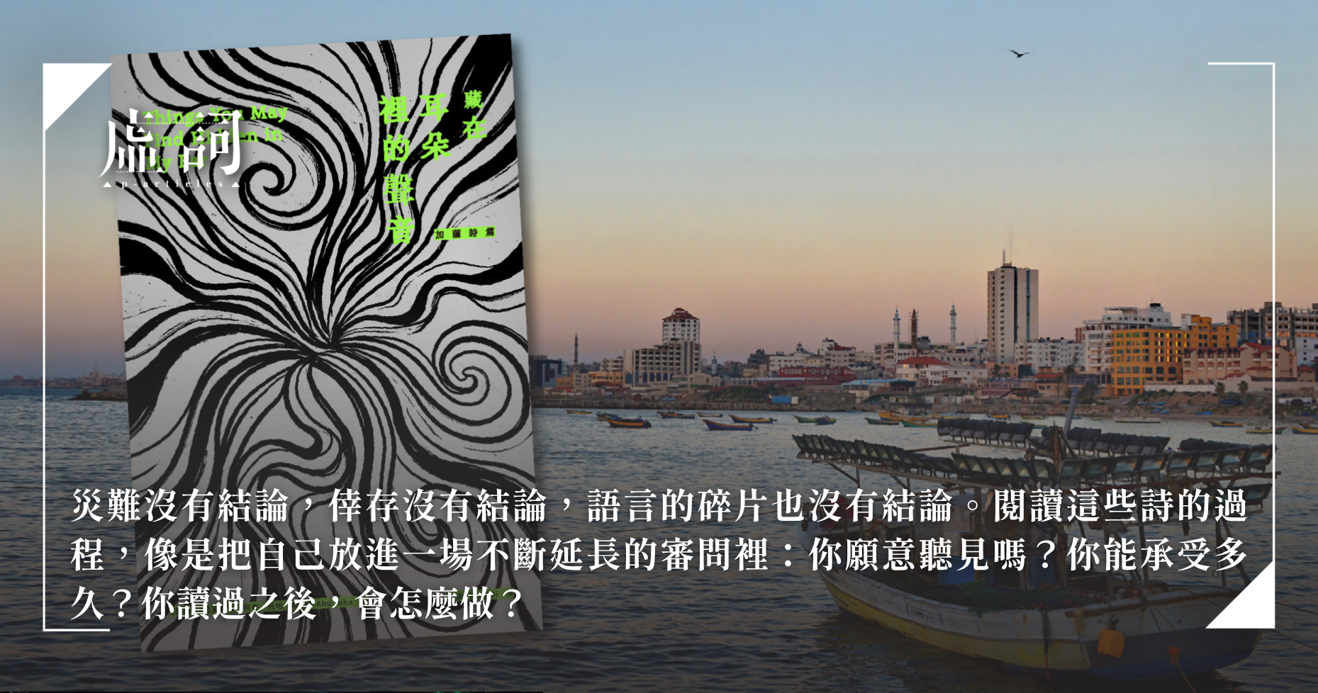 書名裡的「耳朵」始終提醒我:災難不是圖像,而是聲音。影像可以被重播、被切換,但聲音的顫動無法迴避。耳朵沒有眼皮,不能閉合,它只能持續接收。阿布.托哈的詩把這種被迫的接受,轉化為一種倫理:我們該如何聆聽遠方的痛苦?