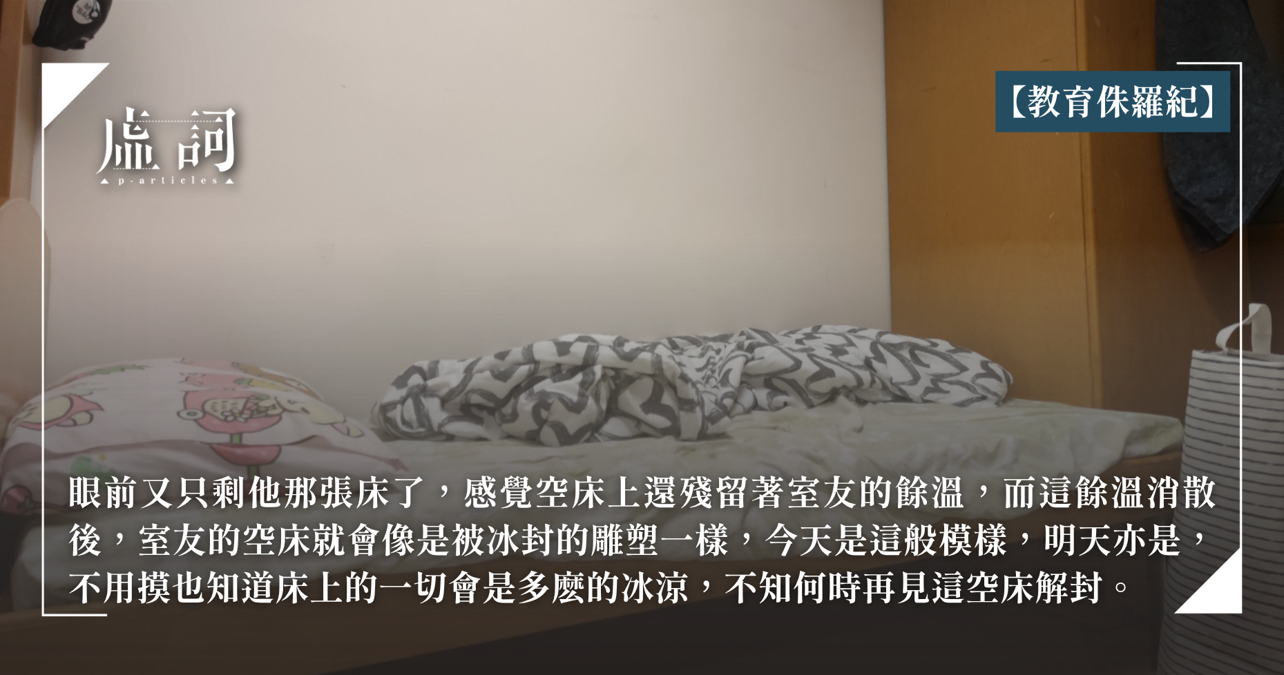 討論完後,室友說他今天會住在宿舍,於是我們一同離開了。剛走沒幾步才發現我的筆記漏在了自修室裏,我和室友説了聲,希望讓他等等我,便匆忙地回到自修室門前,回首一看,室友依舊走著,沒有停下等我的意思。就如陌生人一樣,他不作聲地進入了電梯,我嘆了口氣,隨後一頭扎進了自修室的黑暗中。