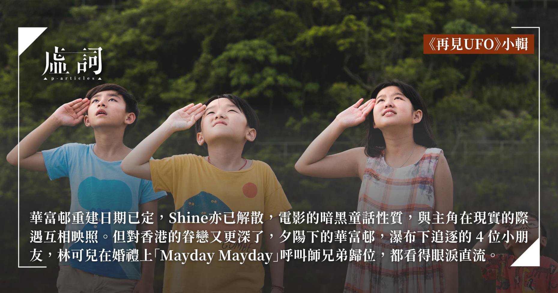 由梁栢堅執導,塵封8年之久的《再見UFO》於今年3月終在香港正式上映,並在今年的香港電影金像獎奪得「最佳電影」、「最佳導演」及「最佳編劇」等5個主要大獎,亦在香港電影評論學會大獎膺「最佳電影」殊榮。為此,虛詞編輯部組成小輯,收錄3篇影評文章:亞C以將「再見」一詞詮釋為對純真自我的回眸與對理想重逢的堅持,叩問在平凡現實中守住奇蹟信念的可能;易山認為電影透過主角們在動盪歲月中的得失與掙扎,隱喻幾代港人集體情懷的消逝,以此勉勵讀者應誠實且勇敢地活出真實自我;尤思聰則將電影譽為「香港人的《阿甘正傳》」,UFO象徵著在已知明日未必更好的現實中,港人仍憑藉記憶與對自主的追求,拒絕向宿命屈服而堅強前行的意志。