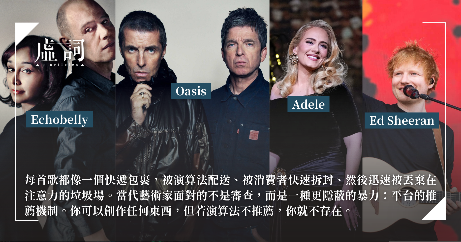Oasis 今年重組回歸被視為流行文化的狂喜,但在忘齋眼中,這不過是一場精密計算的懷舊生意,他以同期在邊緣倖存的 Echobelly 樂隊作為例子,揭示演算法如何將不合時宜的真實「摺疊」。從 Adele 的「精緻化」情感模型到偶像工業的效率邏輯,忘齋直指在「資本現實主義」的籠罩下,藝術已淪為數據物流鏈上的「內容」,正經歷一場溫柔的安樂死。