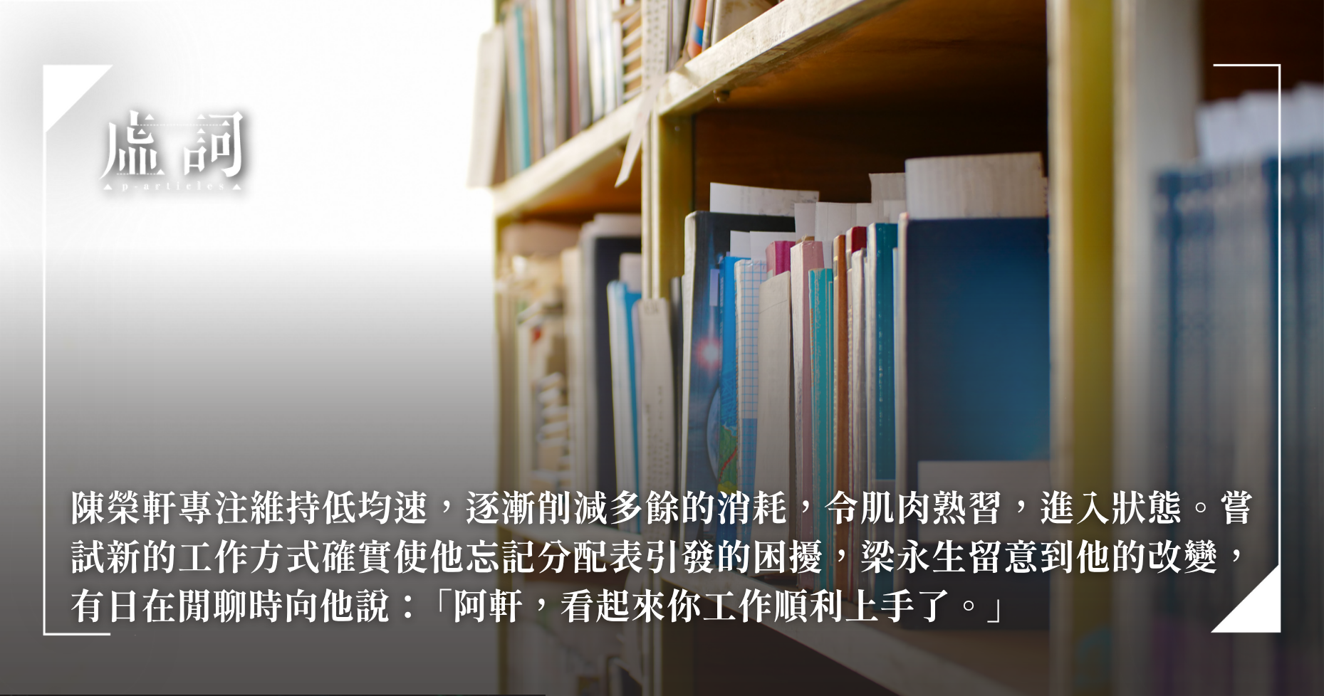 稀稀碎碎的腳步聲,由遠及近,擦過,是陳榮軒的上司梁永生和一位女助理文書主任,他們着忙談公事,未能發現陳榮軒整理同一本書逾十分鐘了。工作剛開始的第一個星期,陳榮軒很認真對待圖書館管理員各項職責,回收和運移館藏的速度,上架和排架的準繩度。他自己評價自己的表現是比同期入職的人甚至前輩更為優秀,可是往後的日子陳榮軒恍然察覺怎樣也填不滿職務分配表的進度,分配表裡標明的僅是不同時段員工負責的部分,卻欠缺合格的數值準則,他不清楚何時方可住手歇息。後來陳榮軒看見其他年資厚的同事乍似效率不彰並不如他以為的缺少工作熱誠所致,他們刻意放緩進度,節省體力,而且營造全程沒有降慢能力的穩定感覺,只有運動攝影機每秒一千幀的分割始能仔細識破他們連續動作的訣竅。