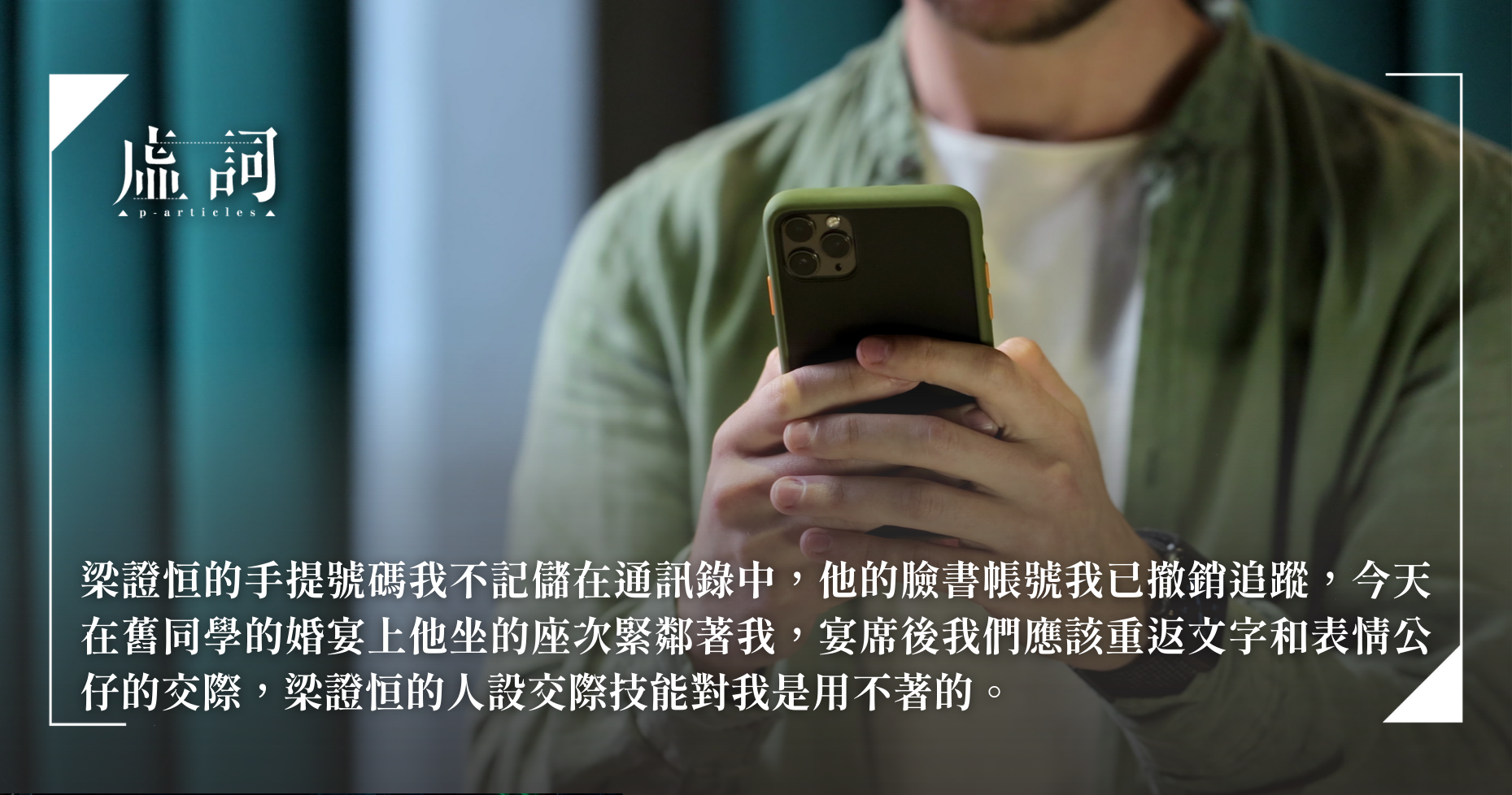 但梁證恒會否找錯對象,我跟他的聯絡限於節假裡傳送祝賀四字詞,他的手提號碼我不記儲在通訊錄中,他的臉書帳號我已撤銷追蹤,今天在舊同學的婚宴上他坐的座次緊鄰著我,宴席後我們應該重返文字和表情公仔的交際,梁證恒的人設交際技能對我是用不著的。
