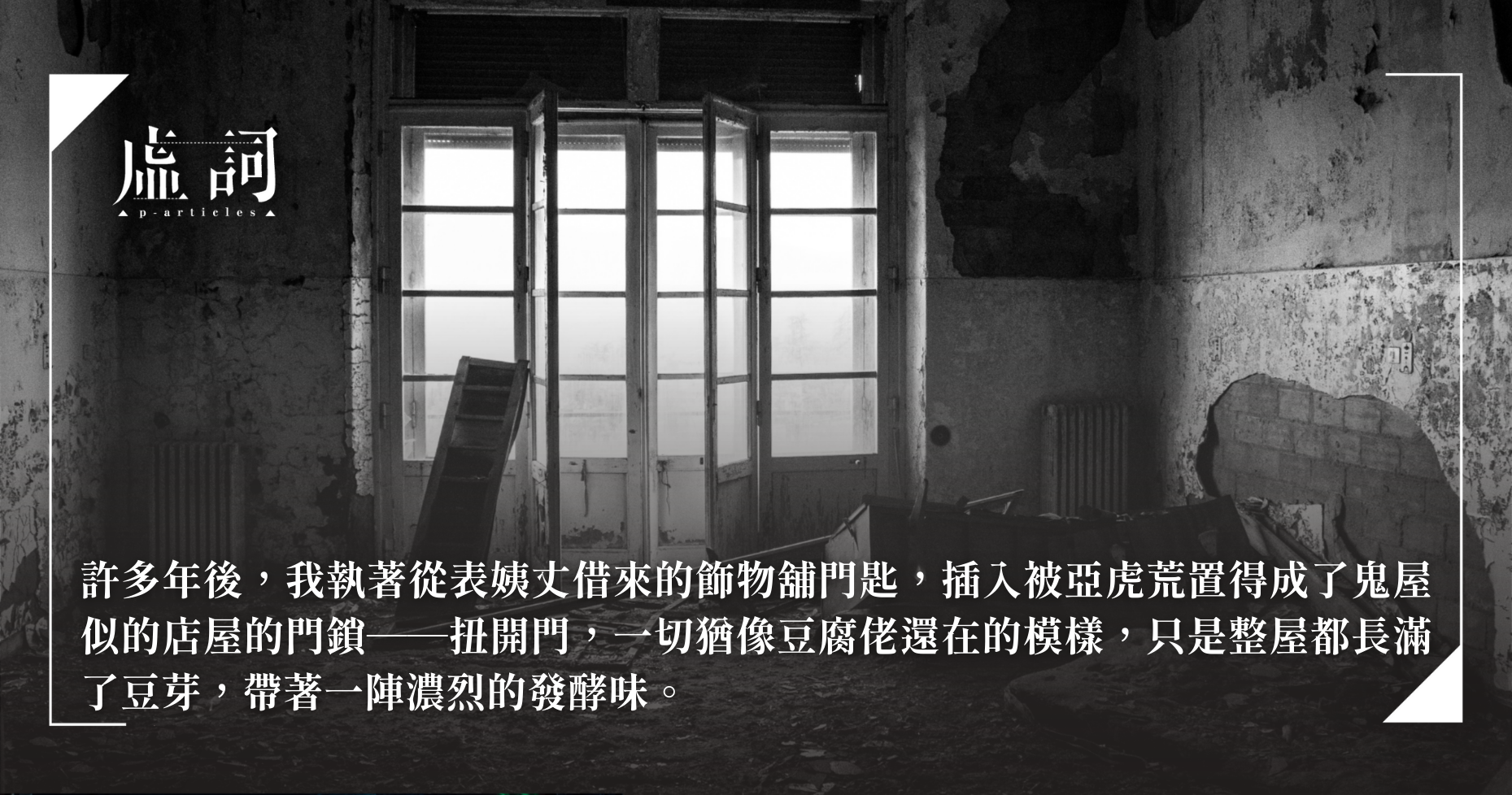 豆腐佬個店頭就在飾物舖對面,亞虎在時他家門前總會多泊了一架客貨車。仁,買咗啲新嘅劇集比你,阿爸見我投訴睇嚟睇去都係嗰啲戲,就給我買了些看不懂字幕的TVB新劇解悶。其實阿姆和阿爸都滿喜歡看它們的,那時我們一家人每晚就待在客廳看電視,直到阿姆告訴我太夜了要睡了為止。縱然他們不會承認,我講了你聽,你亦只覺荒唐,我仍想把它說出來。那段日子的某個雨夜,大概是再看不見對面停泊著客貨車的幾日後,我們一家人如常在客廳看電視,突然聽到一些像是呻吟似的怪聲,接著還聞到一陣豆製品發酵的黴味。那時阿爸去了上廁所,客廳剩我和阿姆,本來都不覺得奇怪,許多個雨夜都是這樣,照舊在沙發看電視。直至那種發酵味愈來愈濃,我們扭頭就望見豆腐佬站在走廊,狀貌痴痴呆呆的,好像有話要說,但喉頭內哽了一塊痰或泥似的。盛公,你──阿姆見狀沒有把話說完就馬上攙扶他回家。許多年來,我都想不到他是怎樣來到我家客廳的,明明鐵閘就上了鎖。可能夜晚條街黑鼆鼆,兩排啲屋又差唔多樣,咁咪入屋囉,阿姆回來後這樣解釋。阿爸則責怪大家,都話咗要鎖好啲門,就算鎖好咗都check多幾次。那晚上樓睡前,見到阿姆神經兮兮地當夜撥了一通電話。