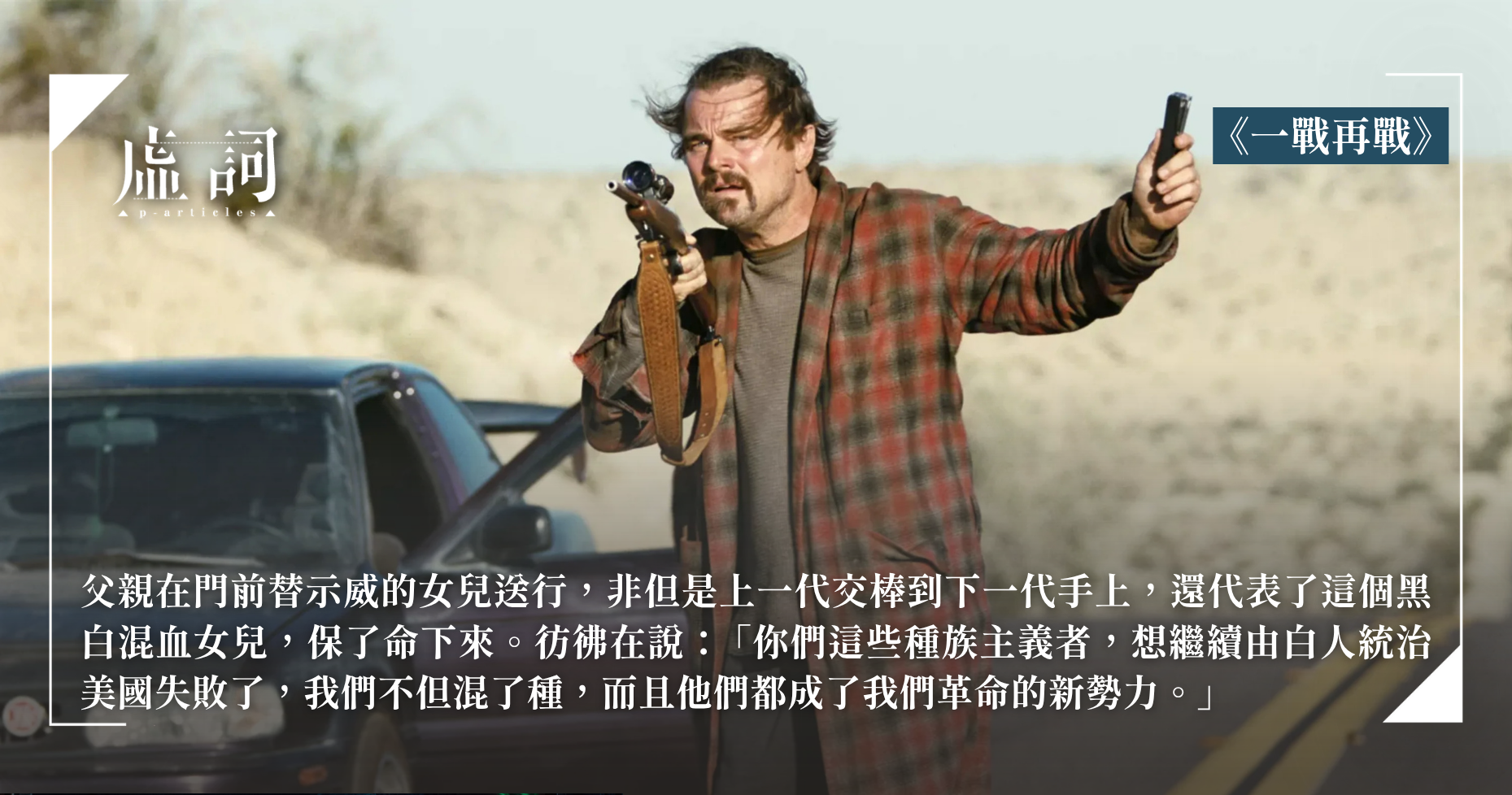 如果你將「一戰再戰」演繹為一代傳一代的革命,那片尾父親在門前替示威的女兒送行,非但是上一代交棒到下一代手上,還代表了這個黑白混血女兒,保了命下來。彷彿在說:「你們這些種族主義者,想繼續由白人統治美國失敗了,我們不但混了種,而且他們都成了我們革命的新勢力。」這跟1969年The Weather Underground宣言說「當年輕白人加入我們的戰鬥,承擔必要風險,美國豬你們小心,我們有一隊軍隊在成長,會將你們拿下你們」幾乎是一模一樣的。