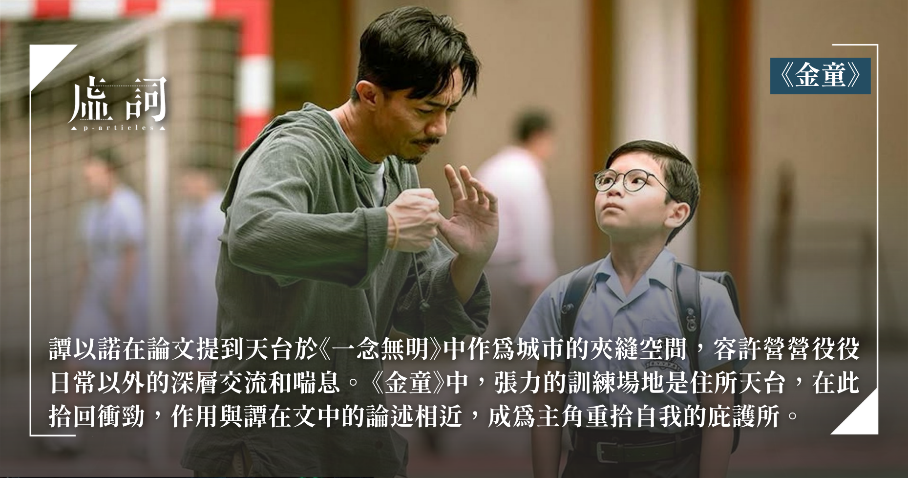 這或許是因為,我最近讀過嶺南大學視覺研究系助理教授譚以諾的論文Hong Kong social issue films: Socio-economic and mental precarisation(「香港社會議題電影:社會經濟與精神的朝不保夕」;早前刊於學術期刊Journal of Chinese Cinemas)。除了演員角色外,電影有好幾幕都令我想起《一》。張力出獄後投靠好友佐治(Dough-Boy飾),二人屈居細小劏房,居住環境與黃大海父子相同,數幕張和佐二人平卧床上吸煙,俯瞰鏡頭將人物上身置中,填滿畫面中央,表現居所空間那近乎令人幽閉恐懼的狹小。《一》有同樣鏡頭影住阿東在上格床不能入寐,傷痛畫面侵襲思緒。譚提到天台於《一》中作為城市的夾縫空間(interstitial space),容許營營役役日常以外的深層交流和喘息。《金》中,張力的訓練場地是住所天台,在此拾回衝勁,作用與譚在文中的論述相近,成為主角重拾自我的庇護所。(A sanctuary where the protagonist can regain a sense of identity […])