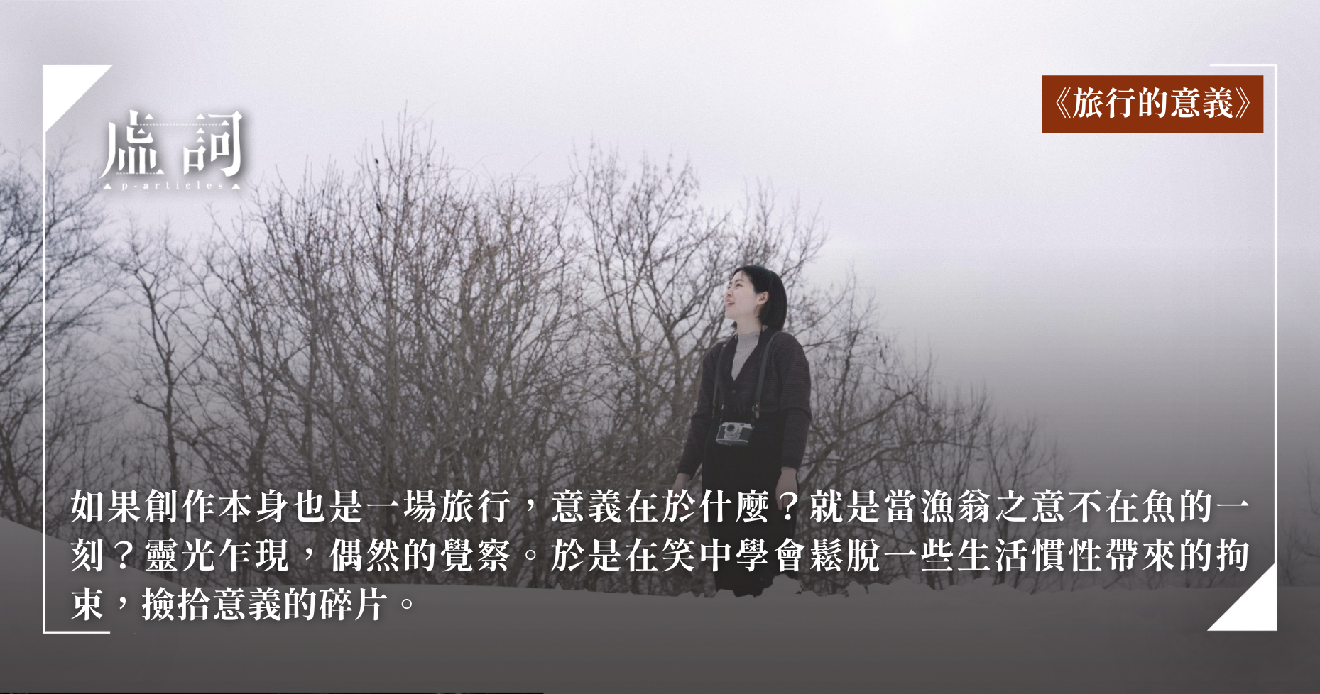 青年和中年的兩個故事因為互相呼應,在敘述兩個基調相近的故事中,或許也刻畫創作者(導演三宅唱)對創作迷惘,但又從創作中重新得到力量的過程。也不禁想問,如果創作本身也是一場旅行,意義在於什麼?就是當漁翁之意不在魚的一刻?靈光乍現,偶然的覺察。於是在笑中學會鬆脫一些生活慣性帶來的拘束,撿拾意義的碎片。如河合優實蹲在沙灘裡,嘗試點亮煙頭明暗的光影,一閃、一閃。