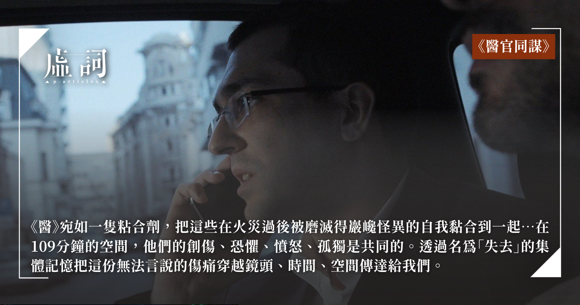 那麼,這齣以憤怒為調,訴說無法訴說的創痛的紀錄片最終成就了甚麼?我想以韓麗珠一次訪問的話作結:「有些人的失去是肉眼無法看見、肯定的,那其實才是最大的失去…但他(韓的外公)真正失去的東西,別人根本看不到。而小說不是跟現實生活對立,小說是一種我們在自身生活中發現的現實,所以我把這些寫進書裡,其實都是日常。」影片中無論是泰迪、那些罹難者家屬、塔利那還是弗拉德,他們都在這場悲劇的後續中各自失去了一些重要的東西,留下了斑駁殘缺的自我,但《醫》宛如一隻粘合劑,把這些在火災過後被磨滅得巖巉怪異的自我黏合到一起。儘管這些人都處於各自傷痛的孤獨中,但至少在這個109分鐘的空間中,他們的創傷、恐懼、憤怒、孤獨是共同的。透過名為「失去」的集體記憶把這份無法言說的傷痛穿越鏡頭、時間、空間傳達給了我們。