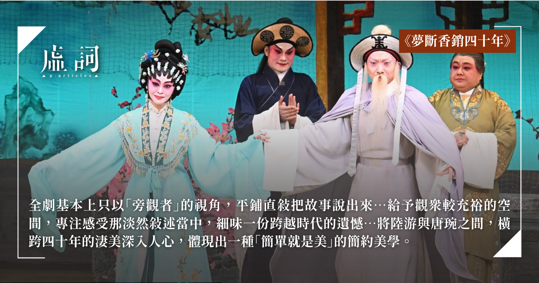 短短三小時的演出,舞台布幕一升一降,眨眼就跨越了四十年,看著台上的「陸游」,由文質彬彬的小生,轉眼變成歷盡風霜的老人,喚起筆者對逝去時間的回憶。記得曾看過一次貼近原始版本的《夢斷香銷四十年》,在第三場〈沈園題壁〉及第四場〈殘夜泣箋〉之間,還有一場〈劍閣悲歌〉,描述陸游北定中原的愛國情懷,以及他事與願違的失意軍途,但現時流行的演出版本,大多會刪走這一場,既能節省時間、人力,又能令全劇愛情的描寫更加連貫、集中;當年筆者剛好正在為自己的通識科獨立專題探究報告收集資料,還近水樓台把該次的觀劇體驗,當作一次實地考察,轉眼通識科已不合時宜,當年台上那個至今仍是筆者心中,氣質舉止最像陸游的「陸游」,亦早已移居海外。同樣坐在高山劇場,看著同樣的劇目,猶如陸游重遊沈園,看著《釵頭鳳》般,感慨萬千。