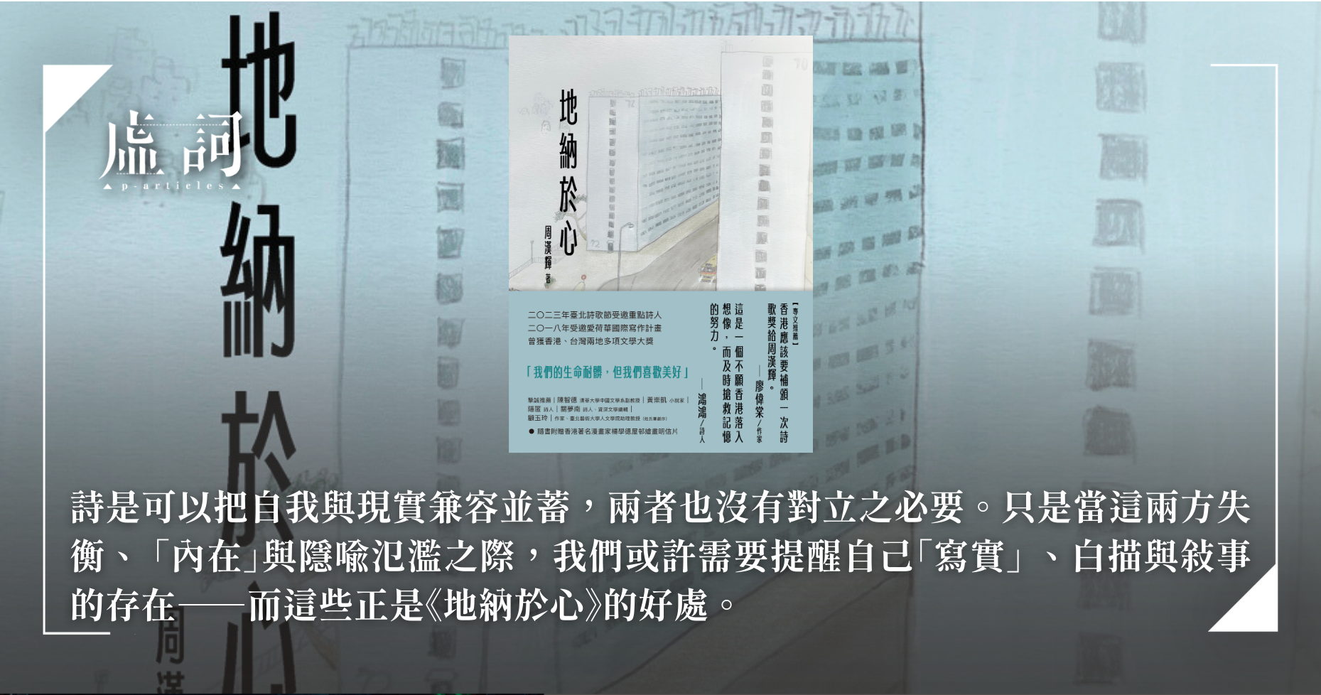 周漢輝自言受黃燦然啟發,寫面向大眾的詩。這讓我想起美國詩人羅桑娜.沃倫 (Rosanna Warren) 的話:「我想寫對歷史負責的詩歌。」歷史不一定是大的歷史、英雄奸佞的歷史,也包括小的歷史、普羅大眾的歷史。而這兩者往往互為因果。在我看來,周漢輝也具備這樣的胸襟,正如其詩中關注的:劏房戶、公屋居民、自殺的小學生、失蹤者、被強姦者、露宿者......詩人有時親歷,有時參與對話,有時退居幕後旁觀。觀察的不只有苦難,也有平凡。而自我的聲音,亦在這些平凡和苦難中若隱若現,恰恰證明了——詩是可以把自我與現實兼容並蓄,兩者也沒有對立之必要。只是當這兩方失衡、「內在」與隱喻氾濫之際,我們或許需要提醒自己「寫實」、白描與敘事的存在——而這些正是《地納於心》的好處。