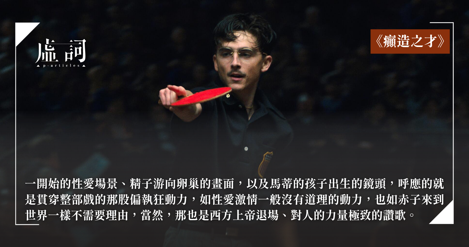 到最後,《癲造之才》確實淋漓盡致地詮釋了馬蒂·瑞斯曼的那番話——最好的乒乓球手,也許是賭徒或走私商,也許不必品德高尚,也不必經歷了執著、修煉而改過、頓悟;也許,追夢的電影敘事亦然,如果反派英雄的電影敘事已成一種過去,那麼,《癲造之才》正為我們昭示對於藝術追求的另一種反傳統突破,另一種即將蔚為大觀的潮流。