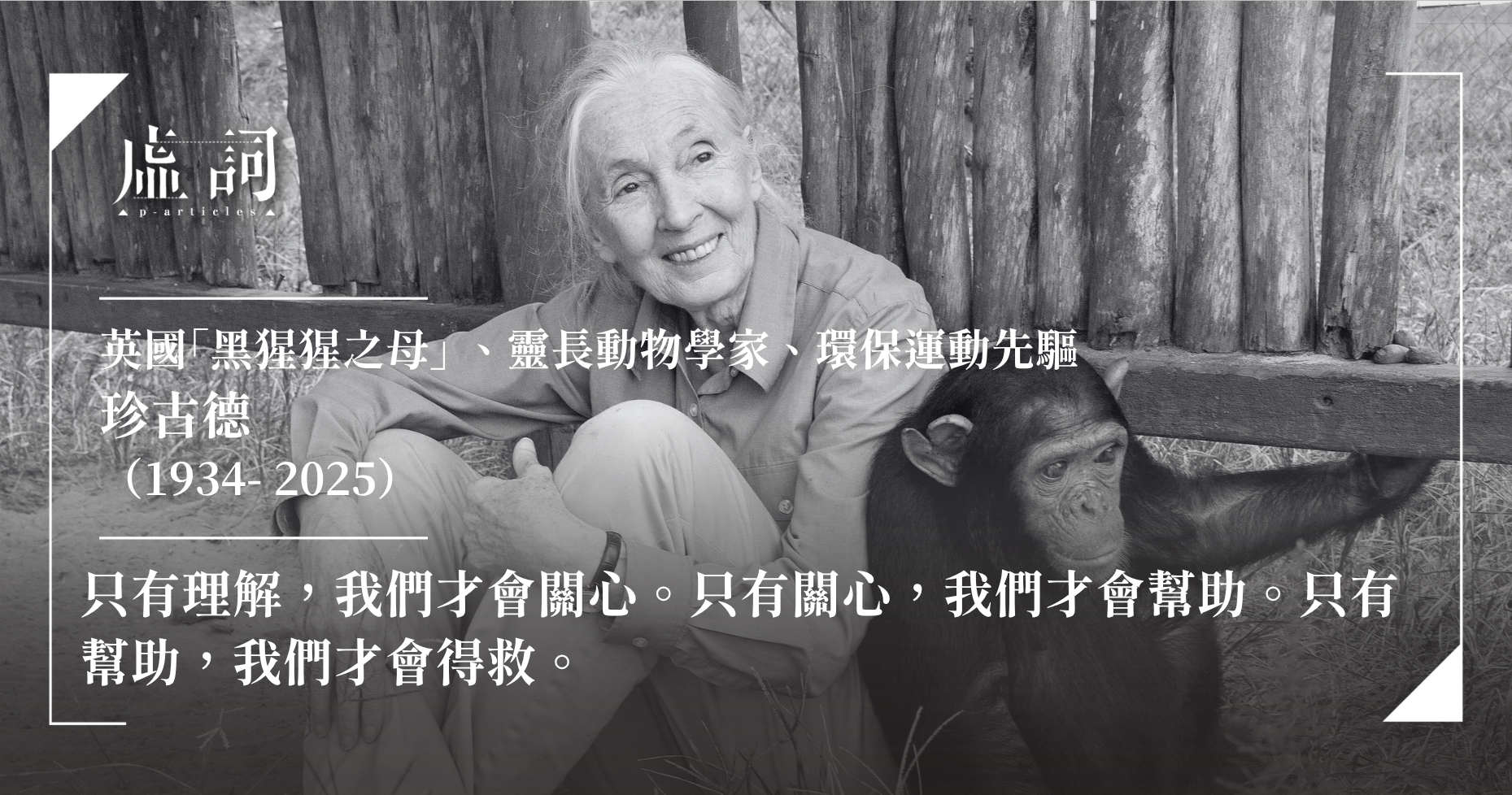 英國著名靈長類動物學家及環保運動先驅珍古德(Jane Goodall)於2025年10月1日在美國加州洛杉磯巡迴演講期間,因自然原因安詳離世,享壽91歲。珍古德研究所發布悼文指,其畢生工作不僅在人類對黑猩猩及其他物種的理解上留下深刻印記,更深遠影響了人類如何看待自身與環境的關係,讚揚她「作為動物行為學家的發現徹底革新了科學界,也是一位為保護與恢復自然世界努力不懈的倡議者」。