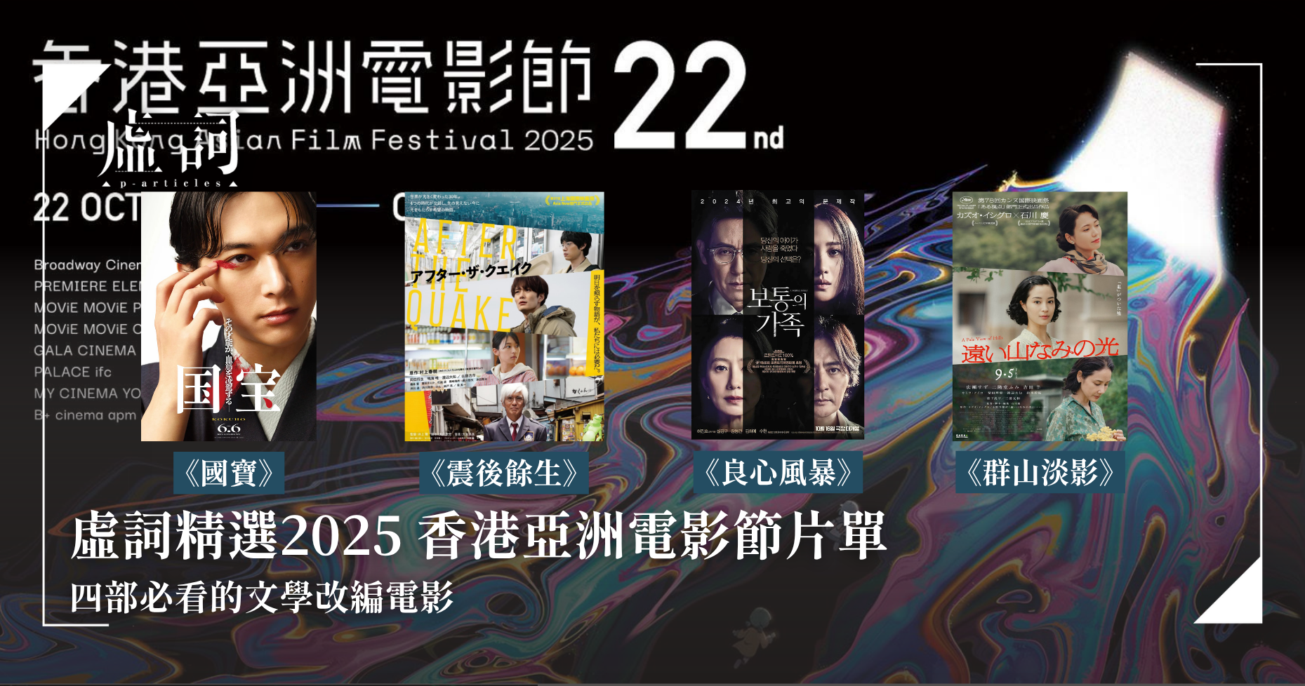 第22屆香港亞洲電影節將於10月22日至11月9日舉行,屆時將放映多達75部電影及短片,影迷或許會面臨選擇困難。有見及此,虛詞編輯部精選了四部由文學作品而成的電影,分別是日本導演石川慶《群山淡影》、日本導演李相日的《國寶》、韓國名導許秦豪執導《良心風暴》以及井上剛與大江崇允執導的《震後餘生》,讓各位影迷藉由電影,體會文學所蘊含的深刻悸動。