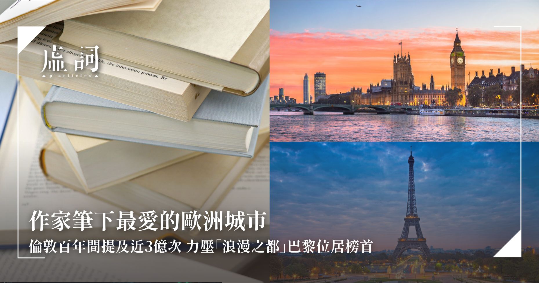 小說不僅是故事的載體,更是引領讀者跨越國界的紙上導遊。許多作品以異國城市為背景,細膩刻劃當地的景觀與氛圍,讓未曾踏足該地的讀者也能在腦海中構建出鮮明的城市印象,完成一次「精神上的旅行」。但你是否好奇過,究竟哪座歐洲城市最常現身於作家的筆下?英國印刷公司 Aura Print 對Google Books超過2500萬冊出版自1920至2019年間小說的進行統計,發現在百年間出版的小說,最常被提及的城市為倫敦,力壓浪漫之都巴黎,而羅馬則位居第三。