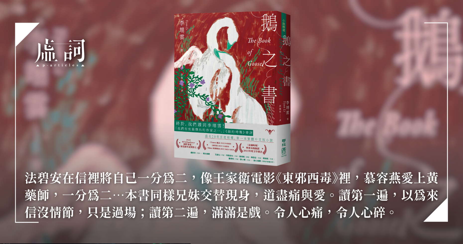 北京出生的旅美作家李翊雲《鵝之書》夷然寫道:「我試圖推開強尼,他不放開我,所以我將他的手移向克拉貝兒的乳房。我對他說,好了,這樣不是更棒嗎?」