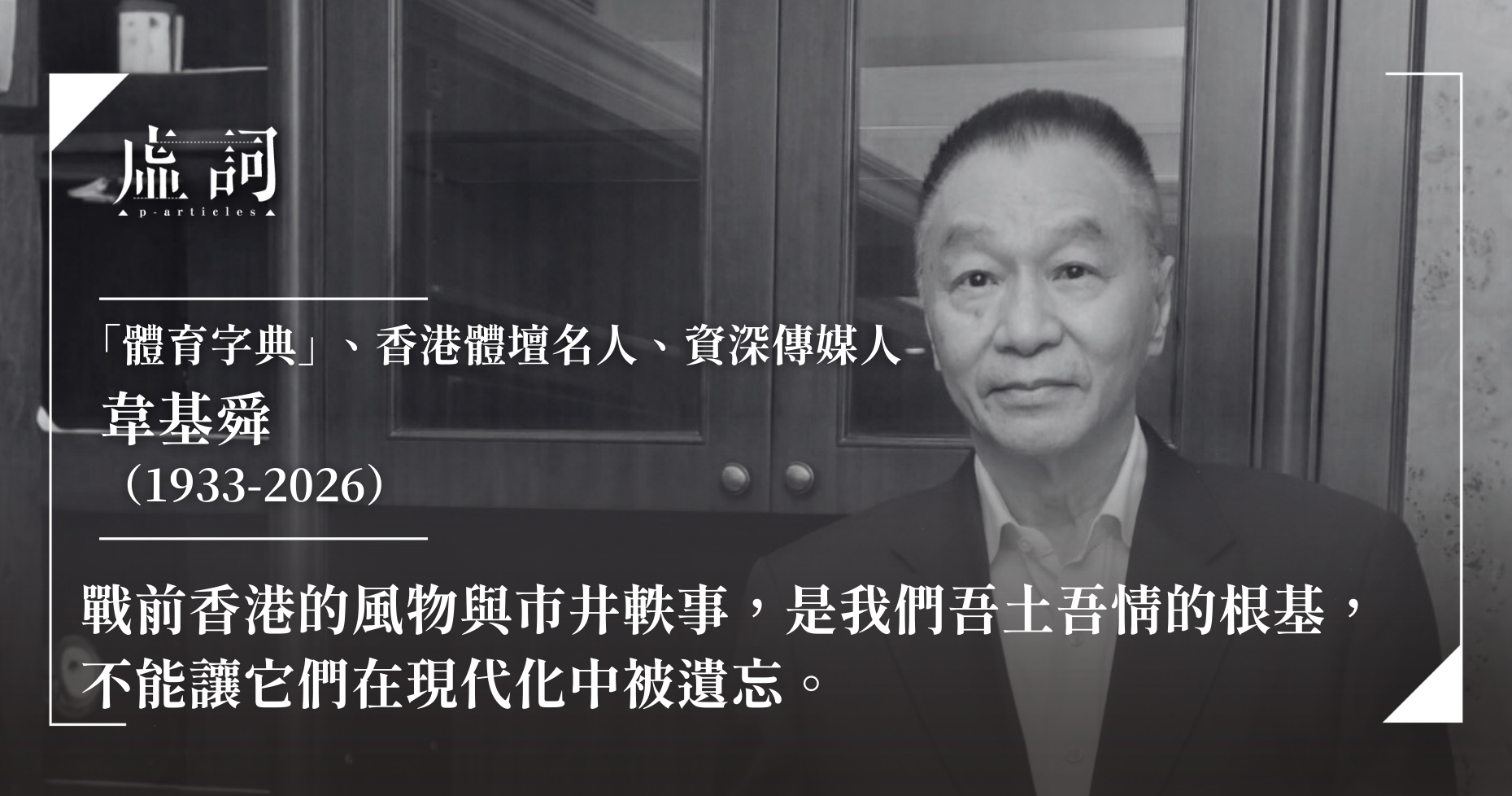 香港體壇名人、資深傳媒人、人稱「韋翁」及譽為「體育字典」的韋基舜,於上周日(8日)逝世,享耆壽92歲。家人表示將遵照韋翁生前意願,低調處理身後事,並定於本月13日在香港佑寧堂舉行追思會。
