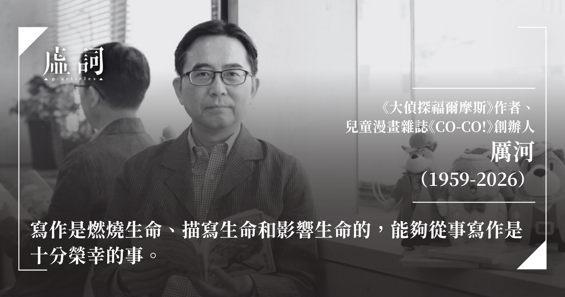深受香港小學生及家長歡迎的兒童偵探小說《大偵探福爾摩斯》系列作者厲河(本名呂學章),今月23日早上安然離世,享年67歲。其妻子著名導演黎妙雪與由厲河參與創辦的「正文社出版有限公司」於25日發佈訃告,證實消息。在正文社訃告中指出他「畢生致力推動香港電影文化。擔任漫畫雜誌總編輯時,悉心培育新一代漫畫人才,影響深遠。」痕