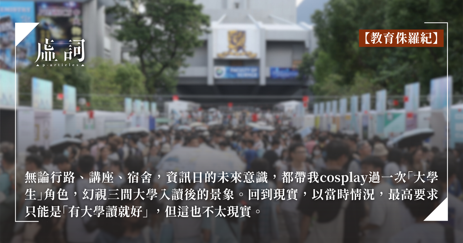 聯招排志願肯定會有A1、A2、A3,資訊日也恰好去了三間,這倒不是說,BandA的三個志願完全就是這三間大學,即使有一間我的確想讀,發夢只能在夢裡。無論行路、講座、宿舍,資訊日的未來意識,都帶我cosplay過一次「大學生」角色,幻視三間大學入讀後的景象。回到現實,以當時情況,最高要求只能是「有大學讀就好」,但這也不太現實。以前那幾屆想讀書的人,九成九都死在英文手上,我也在陣亡名單。通常全校英文最好的那一、兩位,英文有「3」才能突圍出去。其實在中大資訊日回程的時候,現實分數和未來意識就已不斷打交。東鐵綫反復問中學老師,為什麼要「3」級才能達到最低門檻,其實這樣問是因為無法達到,不是我不知道答案。規則寫在那裡,考得到就考得到,考不到就考不到,沒有迴旋、騰挪的空間。即使我的問題重重複複,倒也感謝中學老師耐心回答,沒有嫌我囉唆。