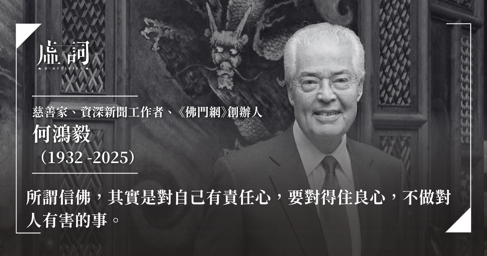 慈善家、資深新聞工作者及加拿大東蓮覺苑創辦人何鴻毅(Robert Hung Ngai Ho),於2025年11月30日在加拿大溫哥華安詳辭世,享耆壽93歲。何鴻毅1932年生於香港,出身顯赫的歐亞混血家族,祖父母分別為香港開埠初期的富商何東爵士及張蓮覺居士,父親則為抗日名將何世禮將軍。大學畢業後,何鴻毅於美國《匹茲堡新聞》(Pittsburgh Press)任職記者,其後在《國家地理雜誌》擔任駐華府特派員。回港後,他接掌家族經營的《工商日報》及晚報。退休後何鴻毅定居於加拿大溫哥華,專注研究佛學,隨後在1994年在當地創立加拿大東蓮覺苑,同時亦創辦了佛教全球網上媒體《佛門網》,以承傳祖母張蓮覺居士將佛法弘揚國際的願望。《佛門網》現已發展成重要佛學及資訊平台,不但設有中、英文及西班牙文網站,跨越地域與語言界限宣揚佛法智慧。
