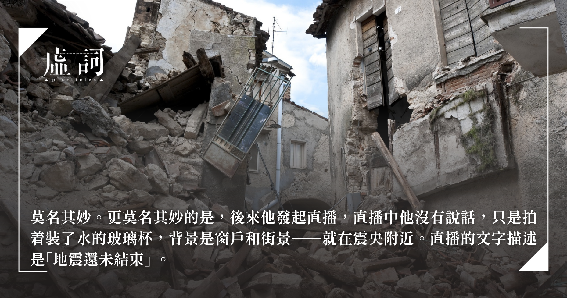 莫名其妙。更莫名其妙的是,後來他發起直播,直播中他沒有說話,只是拍着裝了水的玻璃杯,背景是窗戶和街景——就在震央附近。直播的文字描述是「地震還未結束」。