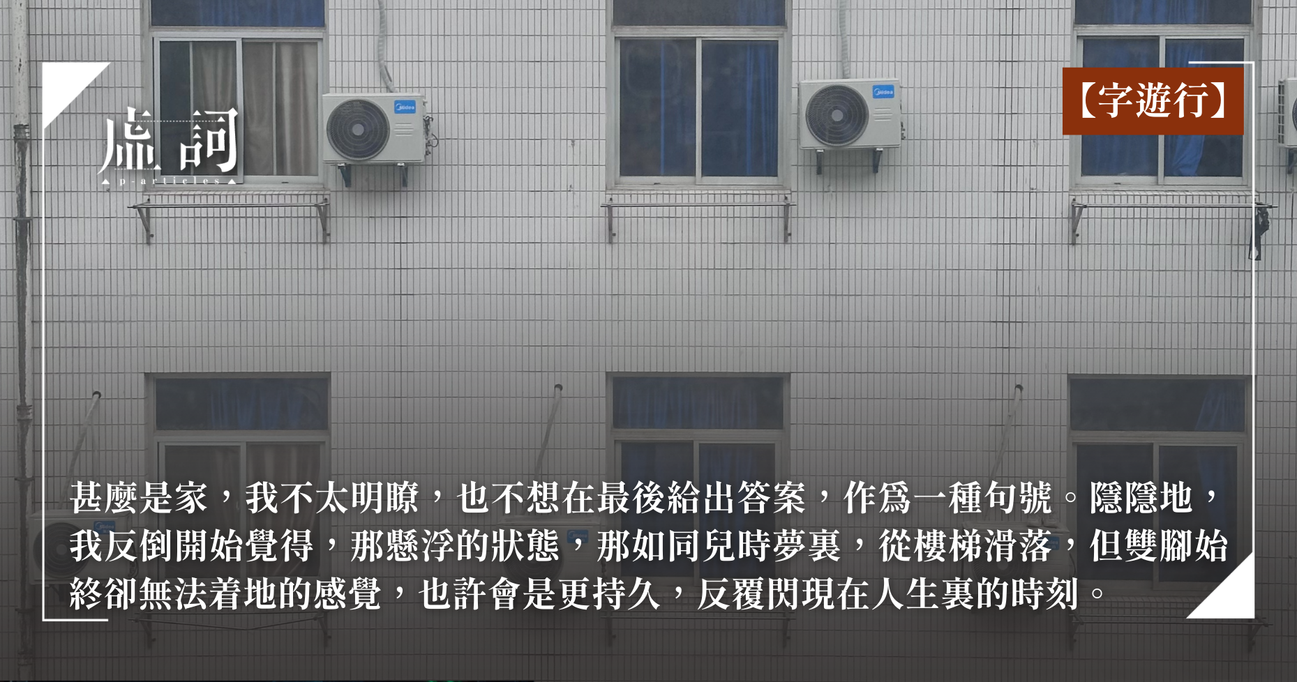 甚麼是家,我不太明瞭,也不想在最後給出答案,作為一種句號。隱隱地,我反倒開始覺得,那懸浮的狀態,那如同兒時夢裏,從樓梯滑落,但雙腳始終卻無法着地的感覺,也許會是更持久,反覆閃現在人生裏的時刻。